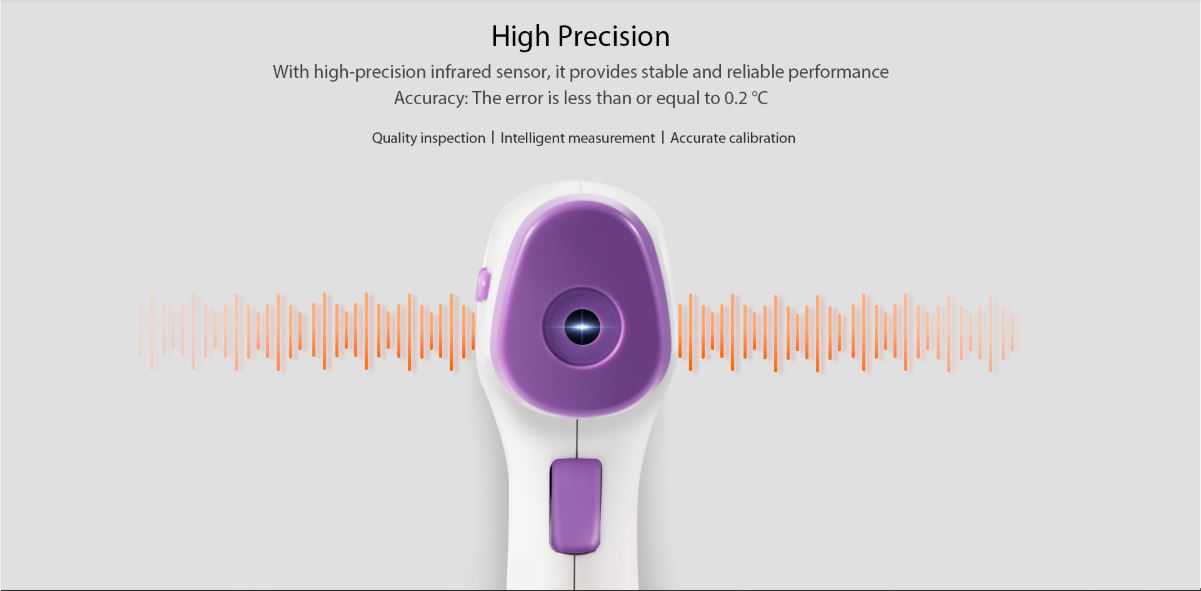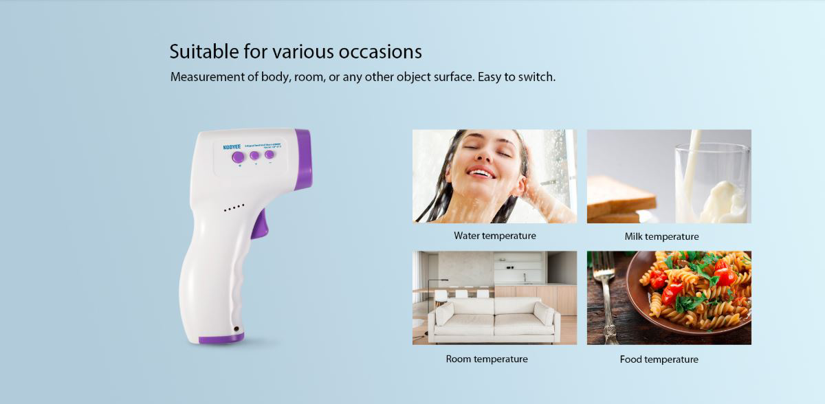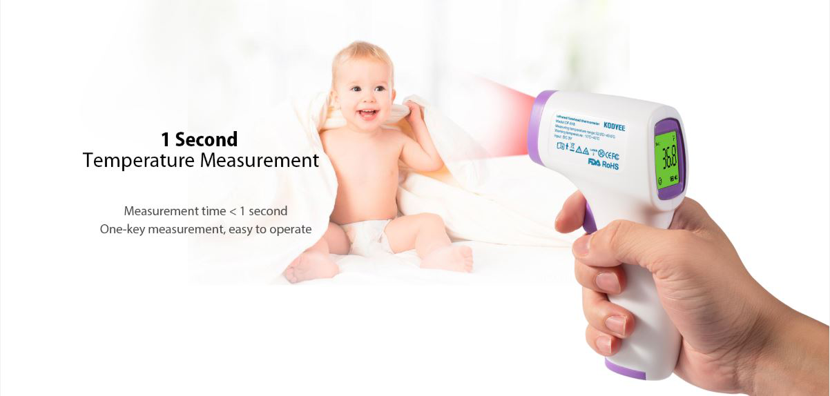 FEATURES- Suitable for both infants and adults. - Automatic shutdown after 30 seconds - Fast and accurate result instantly - Temperature reading in ℃ (Celcius) and ℉ (Fahrenheit) - 30 groups of memory values for easy comparison of temperature changes. - Can also measure the temperature of surface, room, bath water, food, baby milk, etc. - Non-contact infrared technology reads from forehead with no physical contact, prevents cross-infection. |